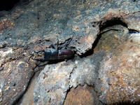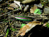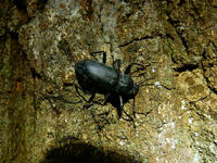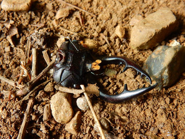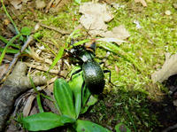 2017年7月29日(土)に訪れた、自宅近くの雑木林の夜の観察記・その2をお届けさせていただきます・・・ヘッドライトで照らされた林床に、ヤマトタマムシさんの美しい鞘羽が落ちておりました。・°・。苔むした樹の幹の上の方に、羽化したてのアブラゼミさんがおりました。・°・。甘酸っぱい樹液の匂いのする方へ近づくと・・・種類までは解りませんでしたが、クワガタさんのメスがおりました(*゜0゜)