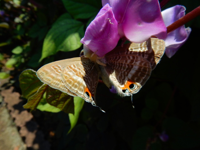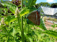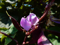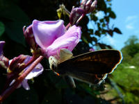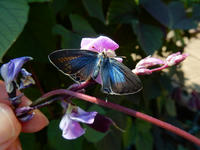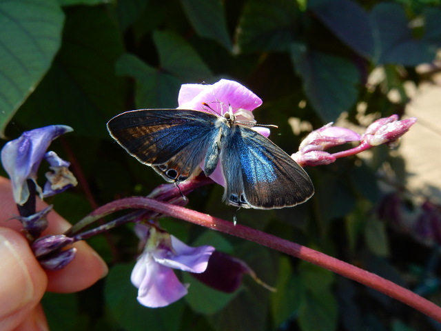 2017年7月22日(土)に訪れた、東京都薬用植物園訪問記・その4をお届けさせていただきます・・・フジマメという花も実もきれいな紫色をしたマメ科の薬草がございました。薬用部分は種子で、食欲増進や下痢止めに用いるそうです。その花にウラナミシジミさんがとまっていたのですが・・・どうも様子が変だなと思い近づいてみますと。。。