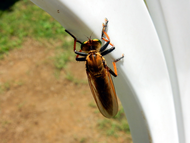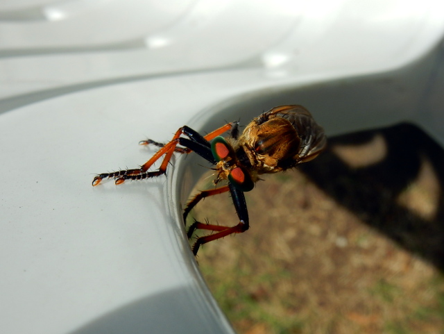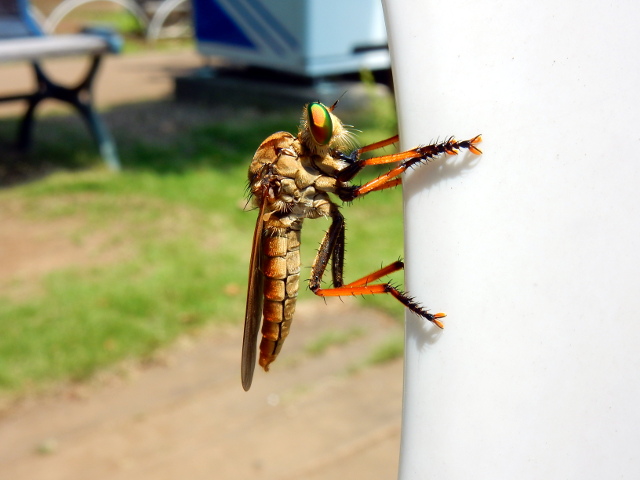 自販機前の休憩所の椅子に、青緑色の複眼がたいへんに美しいアオメアブさんがとまりました。凄腕のハンターとしても知られるムシヒキアブの仲間ですが、できるだけ近寄ってその造形と機能美をじっくりと観察させていただきました(^-^ゞ その6へつづく*この記事の前には11/04(土)分の記事も投稿してございますので、あわせてご覧いただければ幸いです(^-'*)  2017/11/05(日) アトリエ☆イボヤギ 木村大介  アトリエ☆イボヤギ公式Twitter:https://twitter.com/atelieriboyagi1