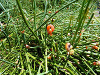 2017年7月22日(土)に訪れた、東京都薬用植物園訪問記・その5をお届けさせていただきます・・・フジマメの花の上で、アズチグモに捕獲されてしまったウラナミシジミさんとは別の個体と、園内で出会うことが出来ました(^^) 表面のメタリックブルーもきれいですが、裏面の細かい波模様も大変ステキです♪  マオウというトクサによく似た植物を初めて知りました。分類上トクサとは縁遠く、裸子植物の仲間でマオウ科に属する小低木とのことでした。解説版にある通り、朱色の丸みを帯びた花も咲いておりました。・°・。*