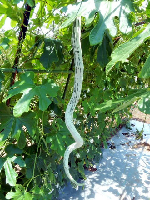 木陰になった池の水面では、うす黄色のスイレンの花が咲いておりました。・°・。初めて観るヘビウリの花は、カラスウリの花によく似ておりましたが、こちらは夜ではなく昼間でもしっかりと開いておりました。そして、その実は・・・和名の通りまるでヘビそのもののように大変細長く実っておりました(*゜0゜)若い実は食用となり、スープや炒め物に利用されるそうで、果実は0.3~1.5メートルになり、熟すと赤くなるとのことでした。・°・。その7へつづく・・・2017/11/06(月) アトリエ☆イボヤギ 木村大介  アトリエ☆イボヤギ公式Twitter:https://twitter.com/atelieriboyagi1