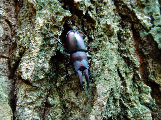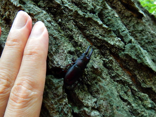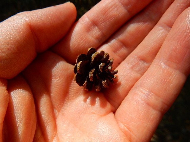 少し木陰になった辺りを歩いておりますと、大きなクヌギ?の樹の上の方から、何やら赤茶色の虫が降りて来るのが目に入りました。。そっと近寄ってみますと、それはノコギリクワガタの短歯形でした(*゜0゜) 手のサイズと比較してみるとその小柄さが分かりますが、小粒ながらもシャープなカッコよさを放っておりました♪ しばらく観察していると、さらに樹の幹を伝って下りてゆき、草むらで姿が見えなくなりました。・°・。オーストラリア園に向かう道すがら、とても小さな松ぼっくりが落ちておりました。これがおかきなら、ポイっと口に放り込んでサクサクと美味しい音を立てそうなサイズでした(o^-^o)♪ その10へつづく・・・2017/10/24(火) アトリエ☆イボヤギ 木村大介  アトリエ☆イボヤギ公式Twitter:https://twitter.com/atelieriboyagi1