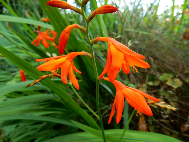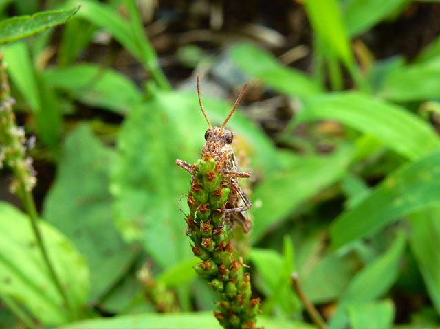 目の前にしだれた枝先には、もじゃもじゃした毛が生えているコウゾの実が付いておりました。・°・。オオバコの穂にはバッタの仲間が隠れているつもりなのか・・・?じっと留まっておりました。・°・。雑木林を出て近所の緑地公園に行くと、遠目にも鮮やかで目立つヒオウギズイセンが咲いておりました。・°・。*