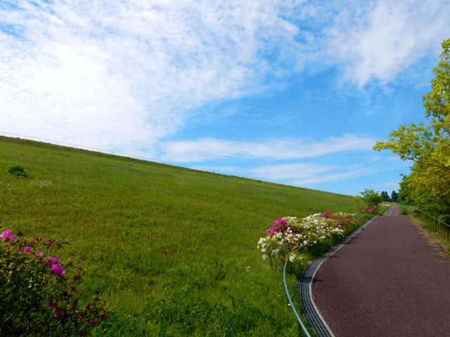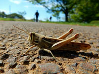 狭山湖畔の広場の木陰で、お弁当を広げてお昼をいただきました。近くの東屋のベンチでは、ナンカイカラスヨトウさんによく似た、黄緑色をした大きな芋虫さんが先を急いでおりました。・°・。広場の草むらから、大きな茶色のバッタが跳び出して舗装路に着地いたしました。後で調べてツチイナゴさんだと判りましたが、トノサマバッタによく似た立派なお姿でした。遠景の人影は、子犬を連れた散歩人ですが、子犬の好奇心でバッタさんはあやうく齧られるところでした・・・(^_^;) 食後は狭山湖畔を散策いたしました。五月晴れの爽やかな青い空のもと、湖面のきらめきを眺めながら気持ちよく歩けました。・°・。その7へつづく 2017/05/28(日) アトリエ☆イボヤギ 木村大介