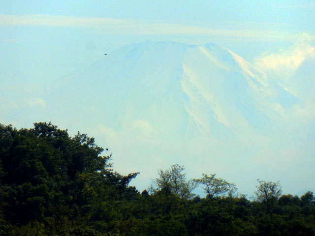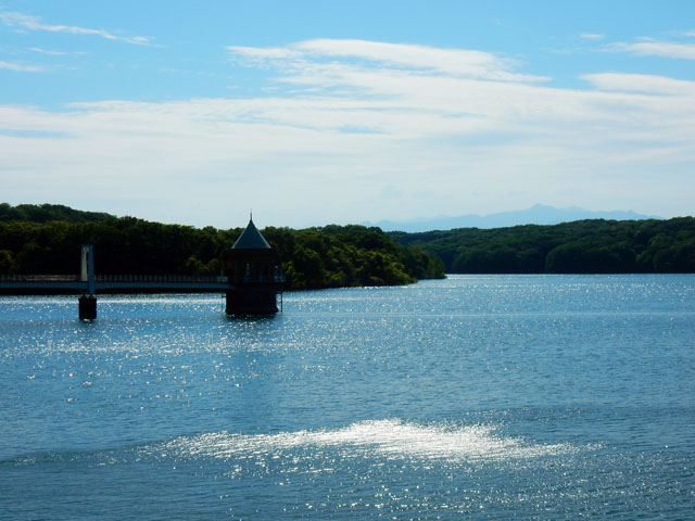 5/4(木)に訪れた、狭山丘陵自然散策記・その7をお届けいたします・・・狭山湖(山口貯水池)の取水塔の屋根の形は、隣接する多摩湖(村山貯水池)のドーム型とは異なっていて、三角錐のトンガリ帽子でした(^^)  薄雲の間からは月齢約7のお月さまが観えました。・°・。〇 堤防沿いの道を歩いて、富士山の見えるポイントに行きました。この日は遠くが少し霞がかっておりましたが、薄っすらとまだ雪化粧の富士山の輪郭が確認できましたヽ(´▽`)/