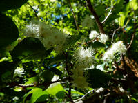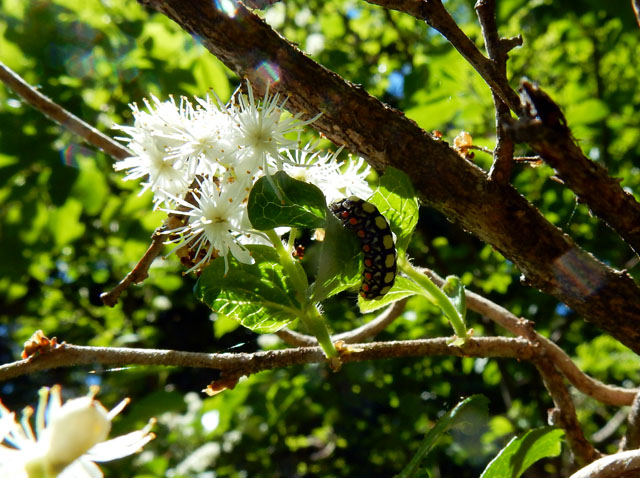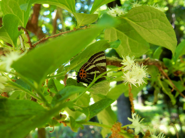白いイソギンチャクのような花の咲いている小低木が、木漏れ日を受けて輝いて見えました。後で調べてサワフタギの花かな?と思い至りました。その樹の葉には、黒地に黄色と朱赤の水玉模様をした丸っこい芋虫さんがついておりましたが、こちらも調べてシロシタホタルガさんというお名前だと知りました。・°・。そして、周囲に見慣れない蝶が飛んでいるなと思い、葉陰に留まったところをそおっと撮影して確認したところ、それは初めて生体を観るトラフシジミさんでございました(≧▽≦)。・°・。その2へつづく 2017/05/30(水) アトリエ☆イボヤギ 木村大介