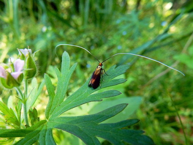 アメリカフウロの葉の上に、触角が異様に長くて、羽の色も大変に美しいクロハネシロヒゲナガさんがおりました。白い触角をひらひらとさせながら優雅に飛び去りました。・°・。同じアメリカフウロの葉の上には、クヌギカメムシさんのお子さんかな?と思われる幼虫もおりました。水辺近くの草の上には、マガリケムシヒキさんかな?と思われる御方が、口吻にアブラムシのような小さな虫を刺しておりました。・°・。その3へつづく 2017/06/01(木) アトリエ☆イボヤギ 木村大介