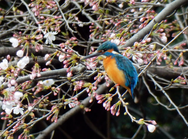 4/2(日)に行った「春の花見の花歩き・その2」をお届けさせていただきます・・・湧水の流れ込む池には、桜の樹が枝垂れかかっていて、まだ咲きはじめのその枝先にカワセミさんの雄が留まっておりました。花のピンクとカワセミの美しいブルーが大変よく映えておりました(*^ - ^*) 池に流れ込んでいる小川のシャガの花には、今年初めて目にするキタテハさんが吸蜜に訪れておりました。・°・。*