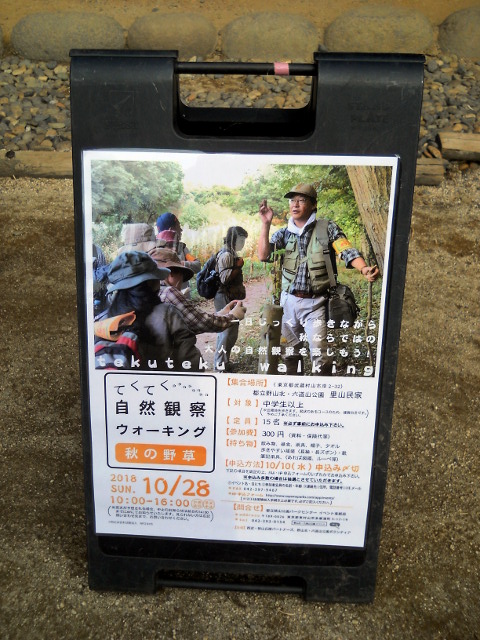 2018年10月28日に狭山丘陵の野山北・六道山公園で開催された『てくてく自然観察ウォーキング~秋の野草~』参加記・その6をお届けさせていただきます・・・里山民家の前には、稲ワラで作られた巨大なトトロ?が立っておりました(*゜0゜) 里山民家の中は訪れた人がくつろげるスペースになっていて、狭山丘陵の歴史や自然を紹介する展示コーナーもあります。囲炉裏の隣に置かれた水槽には、宮野入谷戸の水田で観られる水草を生態展示しておりました。・°・。自然観察会の開会式と簡単な自己紹介の後、てくてく自然観察ウォーキングが始まりました。・°・。林縁沿いの道を歩いていると、木漏れ日を受けて明るく輝くような黄色いヤクシソウの花々が咲いておりました。・°・。その6へつづく・・・アトリエ☆イボヤギ 木村大介2017年の春頃より多忙な状況が重なってしまい、ブログの更新が大幅に遅れた状態が続いておりますが、日付順に少しずつ更新をさせていただいておりますので、引き続きご高覧いただければ幸いに存じます・・・(*´-`) *尚、様々な訪問記の連載が続いておりますために、実際の日付と投稿の内容にもだいぶ時間の開きが生じてしまい、お見苦しい点も多々ございますが、何卒よろしくお願い申し上げます。。!