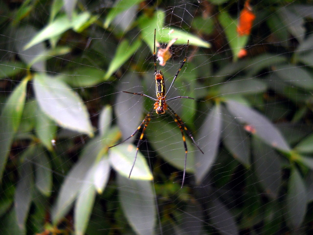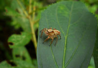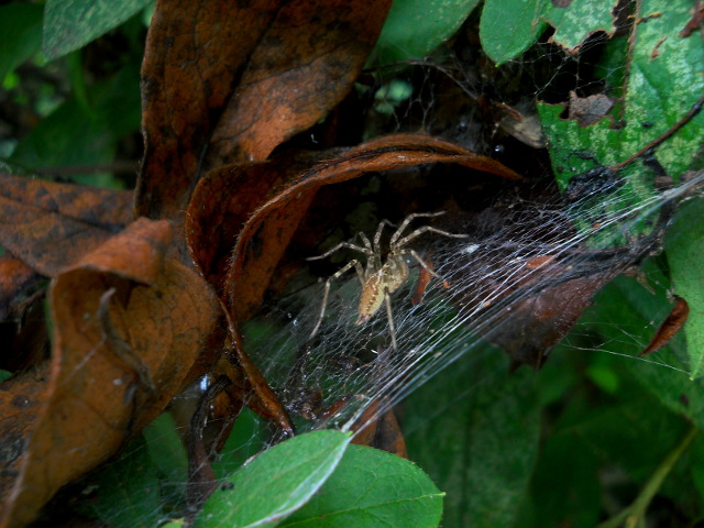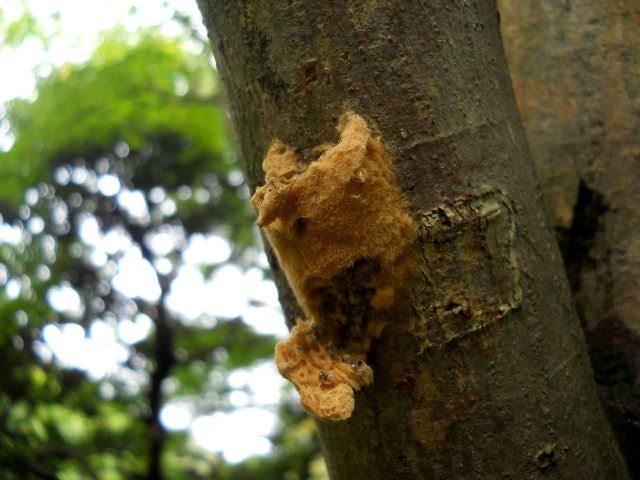 生田緑地の自然観察会リポート・その2をお届けさせていただきます・・・樹の葉のうえにメスのデーニッツハエトリさんが鎮座して、大きな黒い眼で辺りを窺っておりました。・°・。頭くらいの高さの樹皮に、なにやらもふもふとしたラクダ色の毛布の断片のようなものが貼り付いておりました。下の方が一部剥がれかけていて、拡大して観ると何かの卵?のような粒々が複数確認出来ましたが、その正体は不明でした・・・サツキの葉の間には、棚のような巣を張っているクモの姿も観られました。・°・。*