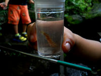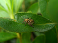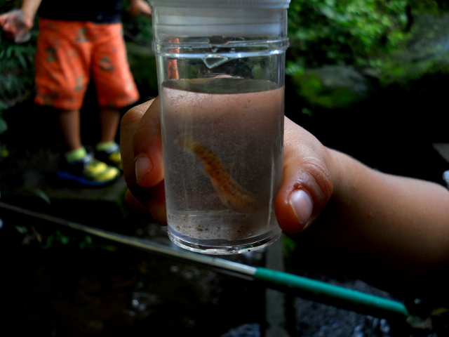 生田緑地の自然観察会リポート・その3をお届けさせていただきます・・・湧き水の流れている小川のよどみで、ホトケドジョウを捕まえた少年が観察ビンに入れてみんなに見せてくれました(観察後はリリースしました)。・°・。せせらぎのそばの散策路では湿度が高いせいか、マイマイさんの姿をよく見かけました。・°・。サツキの葉の上で先程見かけたのと同じデーニッツハエトリさんかなと思ったら、今度はネコハエトリさんのメスでした。ちょっとずんぐりむっくりで、もふもふ感のある姿がかわいらしかったです(*^ - ^*)
