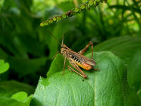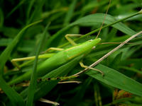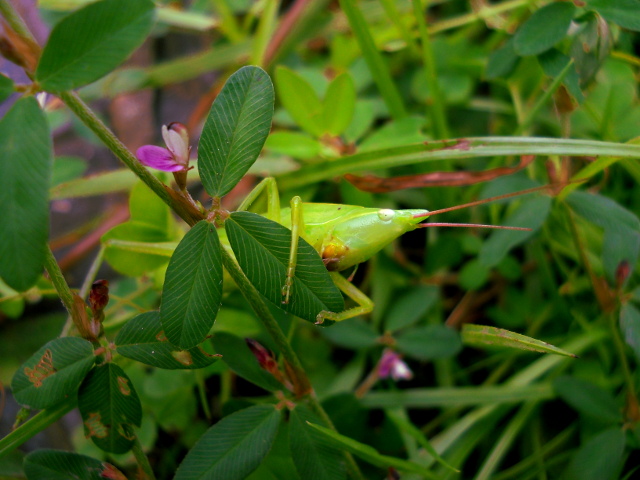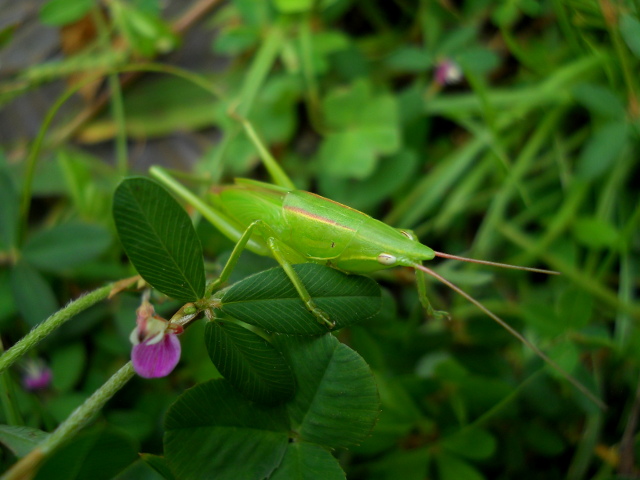 生田緑地の自然観察会リポート・その5をお届けさせていただきます・・・草むらでは若草色の鮮やかなクビキリギスさんの姿も見つけました。鋭い口にかみつかれないように気を付けながら接近いたしました。・°・。*