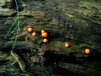 2018年の8月19日(日)~22日(水)に訪れた、北海道東部の旅行記・その15をお届けさせていただきます・・・知床自然センターの、どこかシニカルでかわいらしいイラストを楽しんだ後、センターの近くにあるフレペの滝へとつづく散策路を歩きました。・°・。明るい森の小道を歩いていると、道端の倒木の上にオレンジ色をした清涼菓子のような小さなキノコがぽつぽつと生えておりました。・°・。*