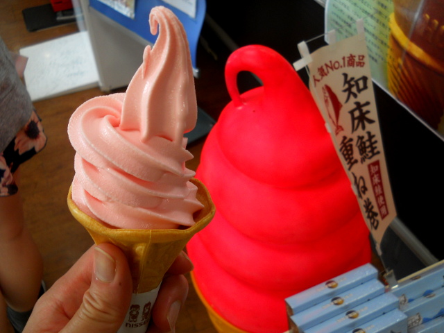 北海道東部の旅行記・その18をお届けさせていただきます・・・フレペの滝から戻る道中、深緑色に輝くセンチコガネさんを見かけました。後で調べたら、北海道のセンチコガネは飛翔能力を失っていて、本州などに生息するものと違い飛ぶことができないという記事を見かけました。・°・。大きな笹の葉にいわゆる「マシンガンホール」とか、ミシン目などと呼ばれる虫喰い穴が空いているのを見つけました。これはまだ葉が丸まっている時に付けられた食み痕だそうです。・°・。再び知床自然センターに戻ってソフトクリームをいただきました。蛍光ピンクに塗られたソフトクリームの看板模型を目にした時、脇に「知床鮭」の 幟(のぼり)が並んでいたので、一瞬、「え゛っ!紅鮭ソフトぉ?!」とびっくりしましたが。。よく見たらコケモモソフトクリームでした(o^-^o)