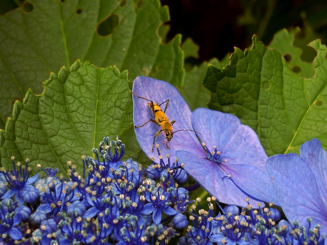 2018年6月14日に訪れた、井の頭自然文化園訪問記・その12をお届けさせていただきます・・・アジサイの花の上に、黄色調の細長いカミキリムシが飛来いたしました。飛んでいる姿は一瞬、蜂のようにも見えましたが、着地すると美しいカミキリムシさんだと分かりました(*゜0゜)後で調べたところ、フタオビミドリトラカミキリさんという種類で、成虫はアカメガシワやアジサイの花に集まるとのことで、この季節に出会えたことをうれしく思いました♪ もっとじっくりと観察したかったのですが、すぐにまた飛び去ってしまいました。。(*´-`) 花の裏には、ちいさなマイマイさんが張り付いておりました(^^) ガクアジサイの真花の集まりの中に、ササグモさんのお尻が見えておりました(*^ - ^*)。・°・。その13へつづく・・・2018/09/19(水) アトリエ☆イボヤギ 木村大介 *この記事の前には2018/09/18(火)分の記事も投稿してございますので、合わせてご覧いただければ幸いです(^-'*)