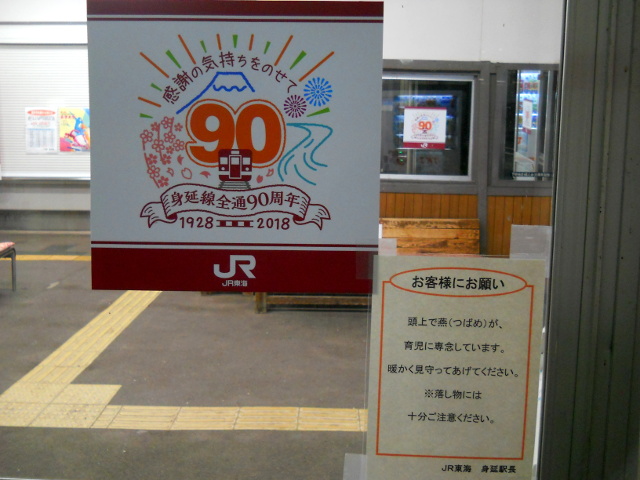 2018年4月30日から5月2日にかけて訪れた「甲斐のくに訪問記・その11」をお届けさせていただきます・・・夕食の後、宿の近くの散策に出ました。身延線の線路に差し掛かると、ちょうど踏切が鳴り出して、下部温泉駅に列車が入って参りました。約10年程前に青春18きっぷで乗車した時のことを想い出しました。・°・。駅の待合室のガラス面には「身延線全通90周年」の案内の脇に、ツバメが育児に専念しているので暖かく見守ってくださいとのお願いが貼られておりました。