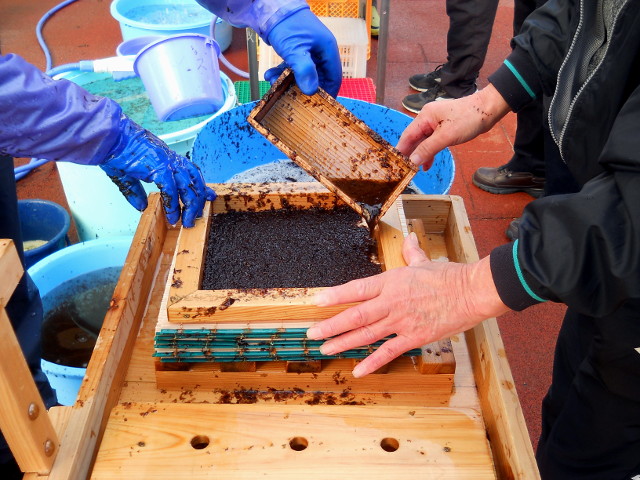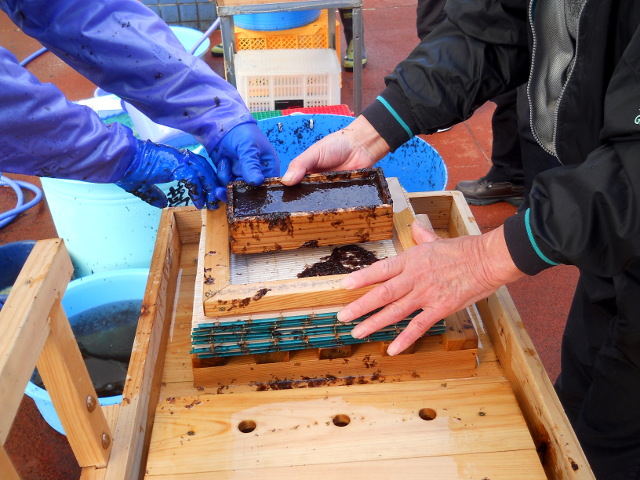 今年の2月11日(日)に東京都葛西臨海公園で開催されていた「西なぎさ 海苔すき体験&試食イベント」の体験記・その3をお届けさせていただきます・・・海苔を漉く順番を待っている間に、前のひとの作業をじっくりと眺めていたのですが、いざ自分の番になってトライしてみると・・・なかなかむつかしいものだなぁと実感いたしました(^_^;) 枡に入ったドロドロ状態の原料海藻を、簾(すだれ)の敷かれた木枠の中に、均等になるように勢いよく流し入れるのですが、バランスのよさとタイミングが要のようです。。左側で手袋をはめているのが職人さんで(右側に写っているのは別の参加者さんです)、目の前でお手本を見せてくださるのですが‥さすがは熟練の技、お見事でした(*゜0゜)。・°・。その4へつづく・・・2018/06/13(水) アトリエ☆イボヤギ 木村大介 *この記事の前には2018/06/12(火)分の記事も投稿してございますので、合わせてご覧いただければ幸いです(^-'*)