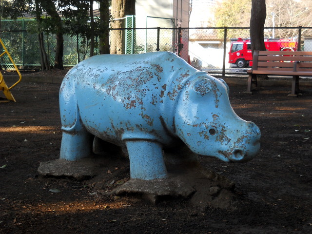 今年の2月4日(日)の訪れた早春の郊外散策記・その3をお届けさせていただきます・・・豊かな緑に囲まれた、古い神社の裏手にある小さな公園には、昆虫を模したステキなオブジェ的遊具がございました(*゜0゜) コンクリートで造られた虫たちはいい感じにデフォルメされており、製作者の愛情が感じられました(*^ - ^*)  隣り合わせてアジア系のサイ(スマトラサイかな?)の仲間と思われる遊具もございましたが、密猟などにより危機的状況にある、野性のサイ達の現況を伝える為なのか?なぜだか耳と角の部分が欠けた状態となっておりました。。(*´-`) *背景に小さく写っている消防車は、キッズの置き忘れたミニカーではなく、隣接する消防署の本物の消防車です。・°・。『早春の郊外散策記・完』 2018/06/10(日) アトリエ☆イボヤギ 木村大介 *この記事の前には2018/06/09(土)分の記事も投稿してございますので、合わせてご覧いただければ幸いです(^-'*)