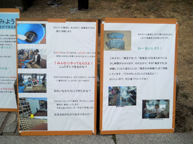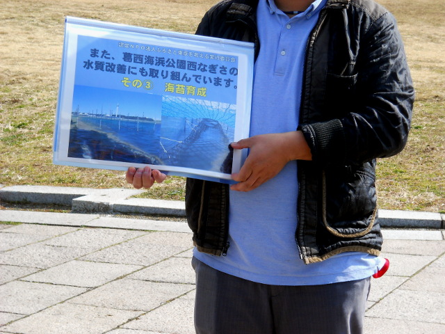今年の2月11日(日)に東京都葛西臨海公園で開催されていた「西なぎさ 海苔すき体験&試食イベント」の体験記・その1をお届けさせていただきます・・・葛西臨海公園には人工的に造られた渚が二つあり、東なぎさは野鳥類の保護区として立ち入りが制限されていて、西なぎさの方は一般の人が海辺に親しむことのできる海浜となっております。その西なぎさの沖合に設置された海苔養殖設備で育てられた海苔やワカメを使った、海苔漉き体験と試食会が行われておりました。実はこの日、葛西臨海水族園へ訪れたのですが、あろうことか肝心の年間パスポートを家に置き忘れてしまいまして(前回着ていた防寒着のポケットに入れ忘れたまま)。。致し方なくとぼとぼと人口渚の方へ向かって歩いておりましたところ・・・園内アナウンスで今回の海苔すき体験イベントのことを、思いがけず知ることになったという次第でした(*^ - ^*) 会場に行ってみると、スタッフの方が写真ファイルを手にしながら、人口渚で海苔を育てることになった経緯や、海苔が出来るまでの手順の他、東京湾の水質向上への歩みなどを解り易く解説してくださいました。足元に置かれたタライの中にはワカメと、海苔の原料となる海藻のサンプルが入っておりました(*゜0゜)