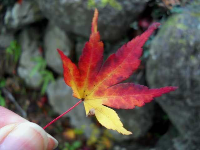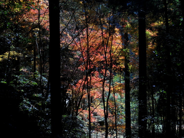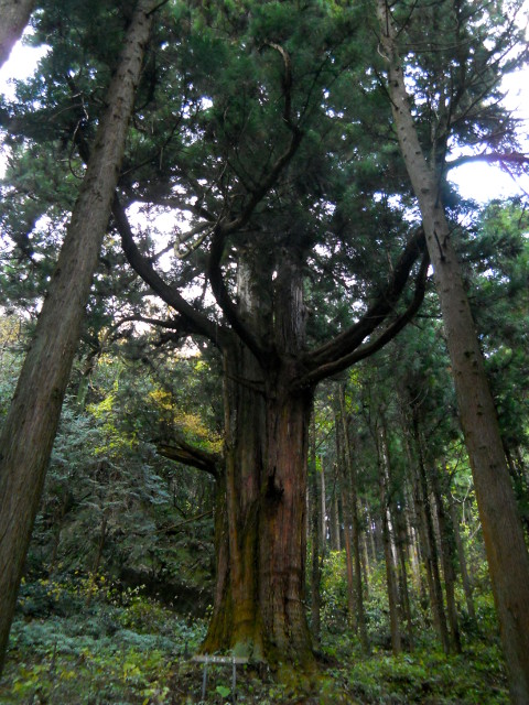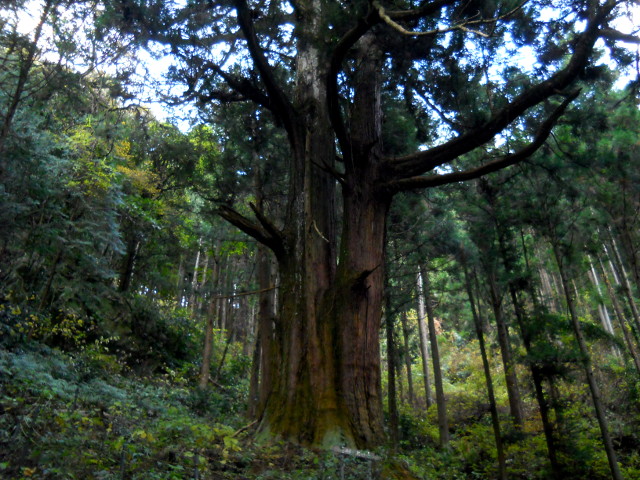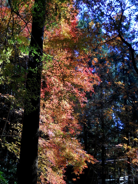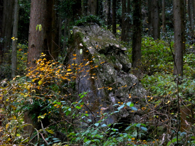 2017年12月2日(土)に訪れた、東京都あきる野市の金毘羅山散策記・その9をお届けさせていただきます・・・目を見張るほど見事な紅葉の下で、色の変わりかけのきれいなもみじを見つけました(^^)。・°・。深沢家屋敷跡から少し歩いた山中にある「千年の契り杉」を訪れました。くねくねとした山道を辿って行くと・・・窪地のような少し開けた場所に出ました。樹々に囲まれて下界の音がほとんど入ってこない為か、あたりはとても静まり返っていて、時折聞こえる野鳥の自鳴きだけが響いておりました。。そんな厳かな雰囲気の中に大きな杉の樹はそびえ立っておりました。・°・。その杉の大木を見つめるかのように、近くにはモアイ似の大きな岩がございました。・°・。*
