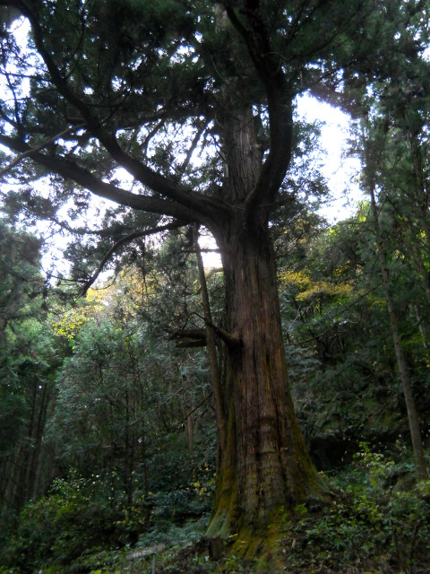 資料によると、この巨杉は幹周り約7.8メール、樹高約45メートルで樹齢はおよそ300年以上とのことでした。近くで観ると二本の幹が上部で繋がっておりました。・°・。凛とした静けさの中でゆっくりと樹の周りを歩いて、畏敬の念を感じました。・°・。千年の契り杉を後にして、沢沿いの道を下っていると、不意に足元を小さな黒い影がすり抜けてゆきました・・・なんだろう…?!と不思議に思ってさらに下っていると、沢の方からこげ茶色をした小さな小鳥が、こちらに向かって枝伝いにゆっくりと接近を試みて参りました(*゜0゜) ちらちらとこちらの様子を窺うようにして、手を伸ばせば届いてしまいそうなところまで来てから、ゆっくりと去って行かれました。。それは初めて観るミソサザイとの遭遇でございました(≧▽≦) 千年の契り杉のところで鳴いていたのは、おそらくこのミソサザイさんだったみたいです。知らぬ間にこちらのことを観察されていたんだなと思いました(*^ - ^*) 薄暗くて写真に収められなかったのは残念でしたが、不思議で素敵な出会いはしっかりと脳裏に記録されました。・°・。実は帰り道にも別の場所で、ミソサザイたちの縄張り争いのアクロバット飛行と、勝どきの?見事なさえずりも聞くことが出来ました。あの小さな身体からは想像もつかないほど力強い飛翔と、その素晴らしい鳴き声と旋律にいたく感動いたしました。・°・。『 初冬の金毘羅山散策記・完 』 2018/03/31(土) アトリエ☆イボヤギ 木村大介