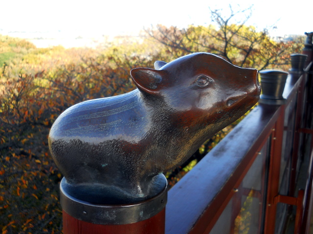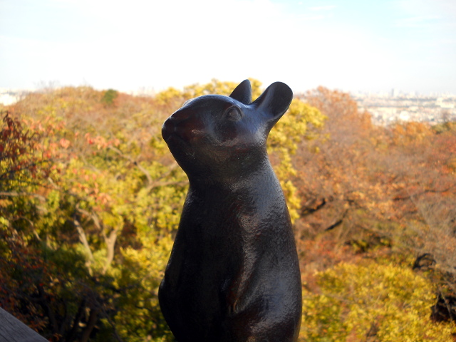 階段を昇って展望デッキに上がると、木立の向こうに遠くのビル群がよく観えました。・°・。展望デッキの欄干には、方位に合わせて十二支の動物たちの銅像が据え付けられていて、それぞれに愛嬌のあるかわいらしい姿かたちをしておりました(*^ - ^*)