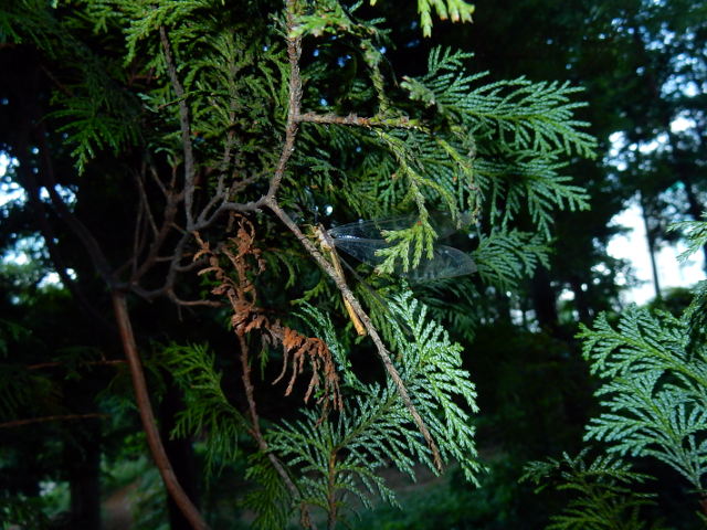 2017年8月27日に訪れた、近所にある小高い雑木林の自然観察記・その3をお届けさせていただきます・・・薄暗い雑木林の中で、カゲロウの仲間がヒノキの小枝にとまっておりました。・°・。池の近くに行くと、紫色と白色のコムラサキの実が成っておりました。・°・。陽がだいぶ傾いてほの暗い水面に、金色の錦鯉さんが顔をのぞかせておりました。・°・。*