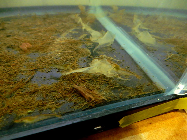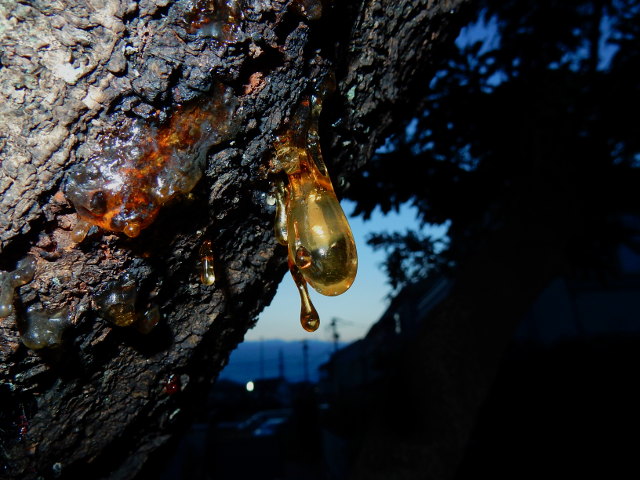 陽の落ちた後の桜の樹の肌から、樹液が大きな滴状になって垂れ下がり、薄っすらと輝いているように見えました。・°・。公園の池で採取して来たヌマエビさんたちを、自宅の30センチ水槽に導入いたしました。半月ほど前に別の池で採取したマツモを入れて水を整えてあったおかげか、ヌマエビさんたちは落ち着いた様子で水草につかまって寛いでおられました。・°・。試しにかつお削り節をひと片入れてみますと、すぐに取りついて食べ始めました♪ 『晩夏の雑木林散策記・完』 2018/01/08(月) アトリエ☆イボヤギ 木村大介  アトリエ☆イボヤギ公式Twitter:https://twitter.com/atelieriboyagi1