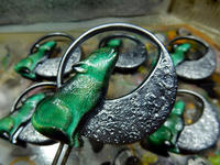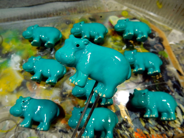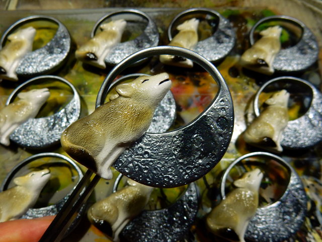 2017年8月29日の話題からお届けさせていただきます・・・帯留め作品の「三日月と狼」とカバ・ターコイズカラーの塗装を進めました。一枚目の写真は三日月の部分を塗装する為に、先に塗装を終えたオオカミの部分をマスキングゾルでコーティングしてから、エアーブラシで三日月の色を塗り重ねているところです。二枚目の写真は全体の塗装を終えてマスキングを剥がした状態です(^^) 三枚目の写真はカバ・ターコイズカラーの仕上げのクリアーコーティングを施している段階です。つやつやのピカピカになるまで塗り重ねて参ります。・°・。*