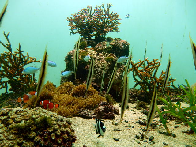 グレートバリアリーフ水槽の白いサンゴ砂の上では、サザナミハゼさんたちがしきりに砂を口にくわえては吐き出すことを繰り返しておりました。・°・。インド洋水槽ではヘコアユさんの群れが、まるで申し合わせたかのようにキビキビとリズミカルな泳ぎ方をされておりました。・°・。紅海水槽ではブルームテールラスさんが、その派手派手な色彩とは裏腹に、岩陰でひっそりと辺りの様子を伺っておりました。・°・。*