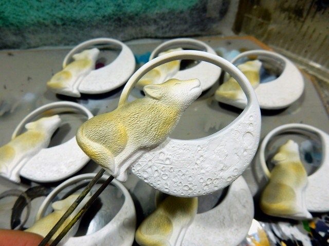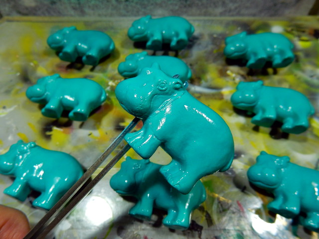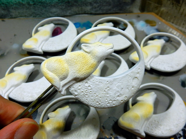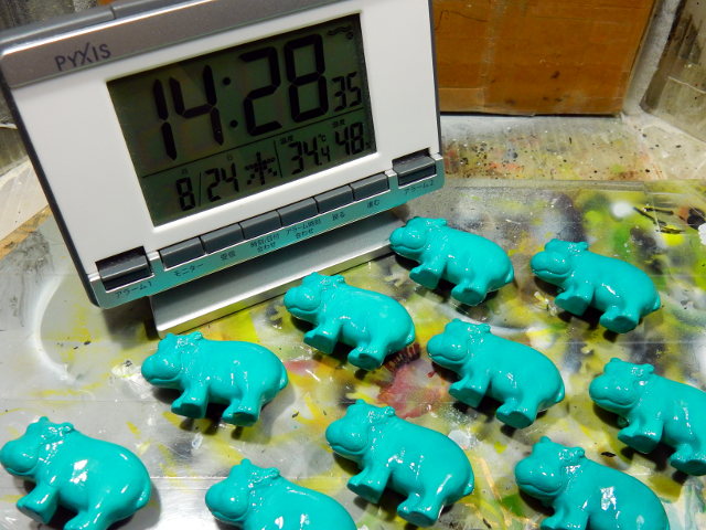 この日は残暑が厳しくて、二階にあるアトリエの室温は34.4℃を指しておりました。。(>_<); ターコイズカラーを吹き付け終えた後は、面相筆で爪や目の色を施してゆきました。・°・。2017/12/26(火) アトリエ☆イボヤギ 木村大介  アトリエ☆イボヤギ公式Twitter:https://twitter.com/atelieriboyagi1