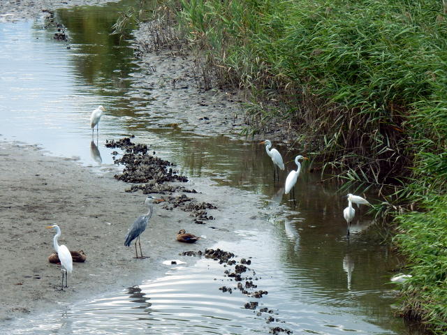 2017年8月13日(日)に訪れた、葛西臨海公園&鳥類園訪問記・その9をお届けさせていただきます・・・下の池の海側の水門近くには、たくさんの大型サギたちが集まておりました。ダイサギさんは何かに狙いを定めて、首をゆっくりと動かしておりました。。